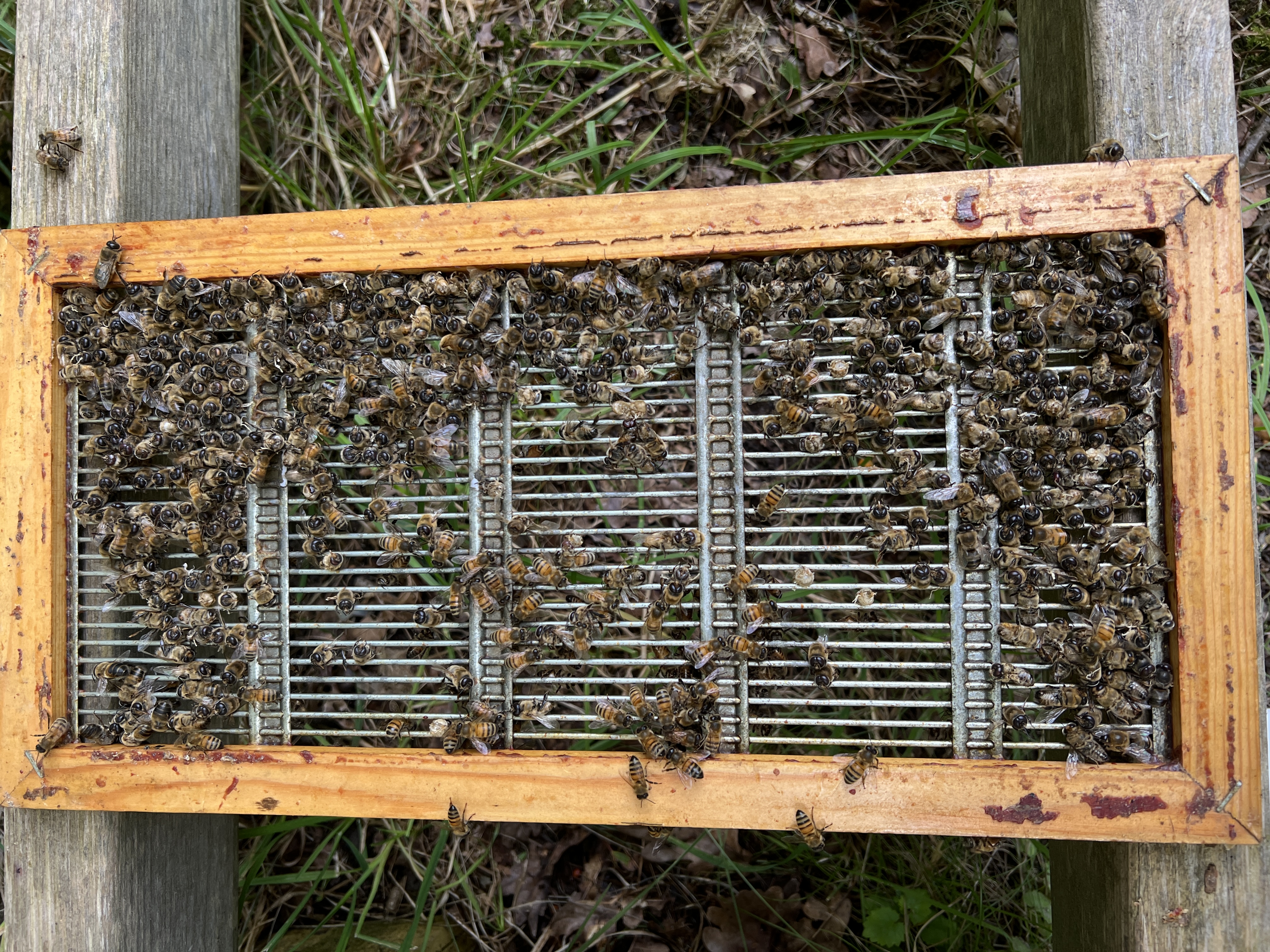 I skattlådan hittar jag även två täckta drottningceller och min teori är nu att jag har flyttat upp en ram med honung och yngel till skattlådan för att samla honungen där, men missat att det även var drönarcelller och att dessa svultit ihjäl i skattlådan? Dock fanns det lite honung inramats (inte mycket) och ändå undrar jag nu varför de har dragit upp två drottningar där?